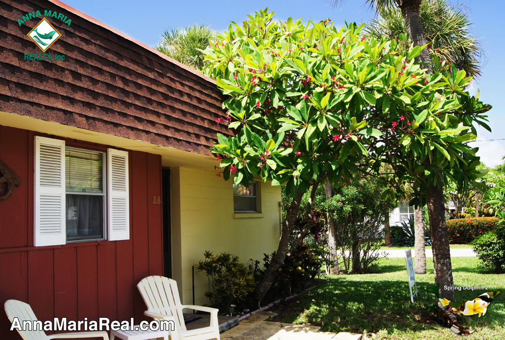 218 Spring Avenue, Anna Maria is a cozy duplex that offers beautiful Florida flora in the manicured yard, while being less than a mile from the the Gulf and prime Anna Maria Island restaurants and shops.